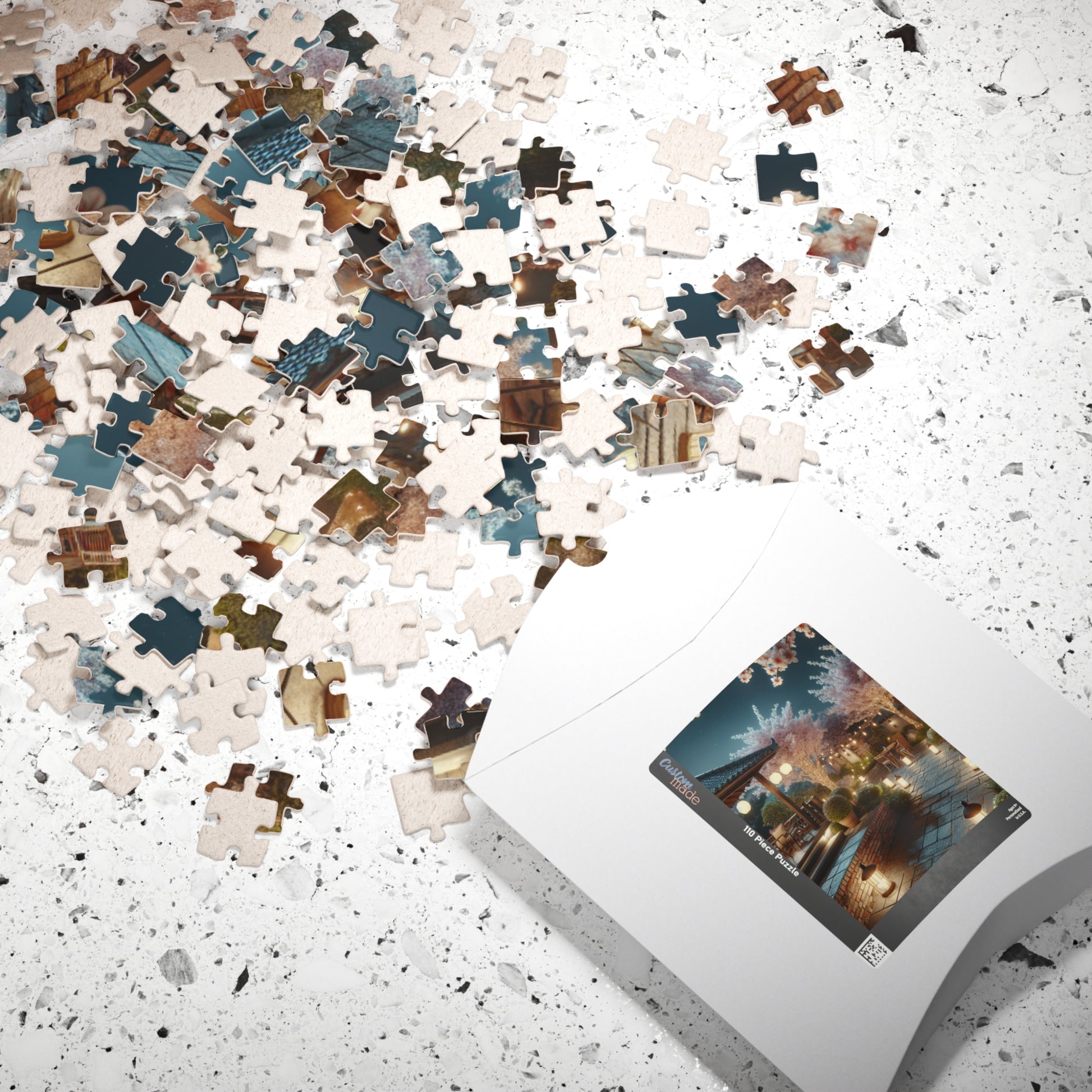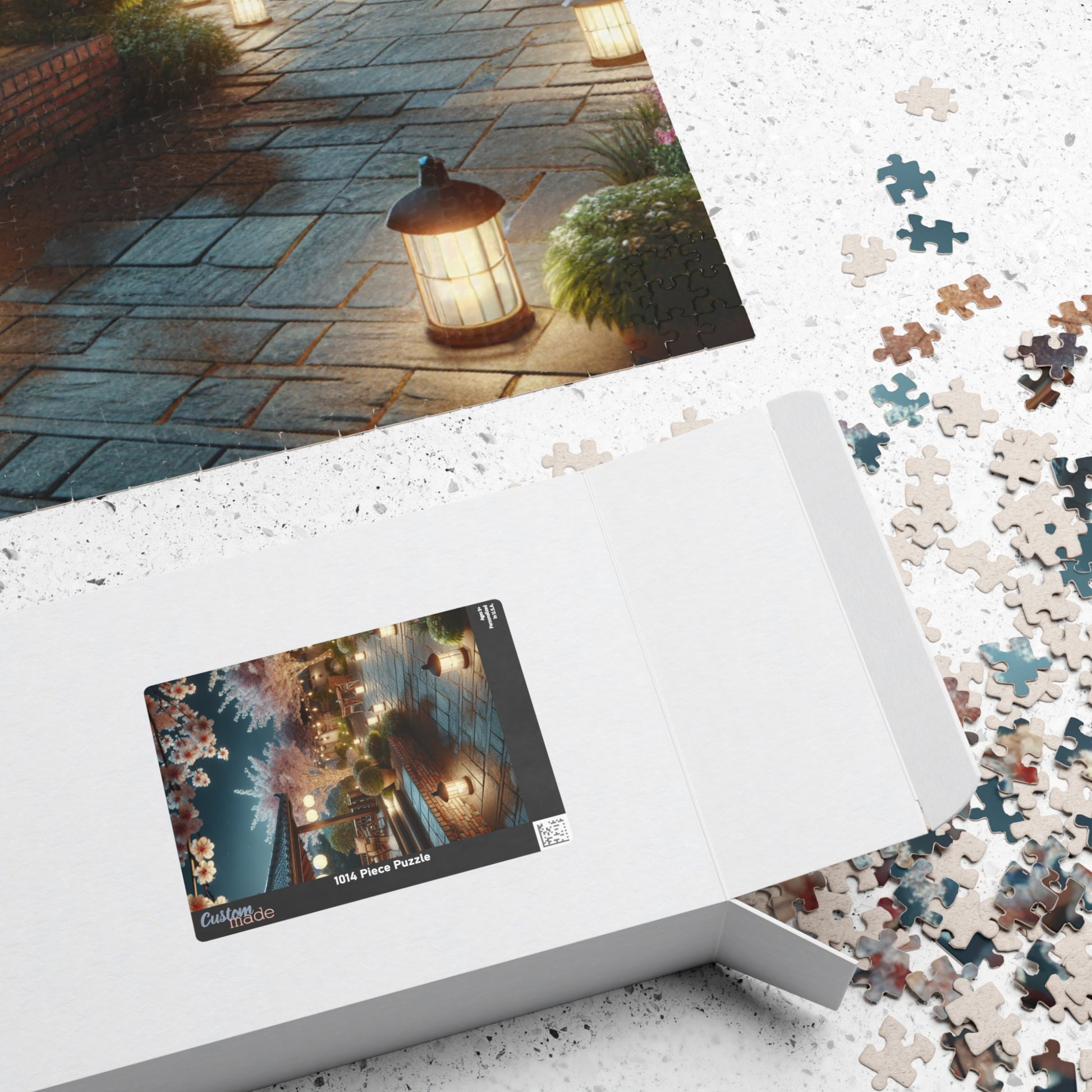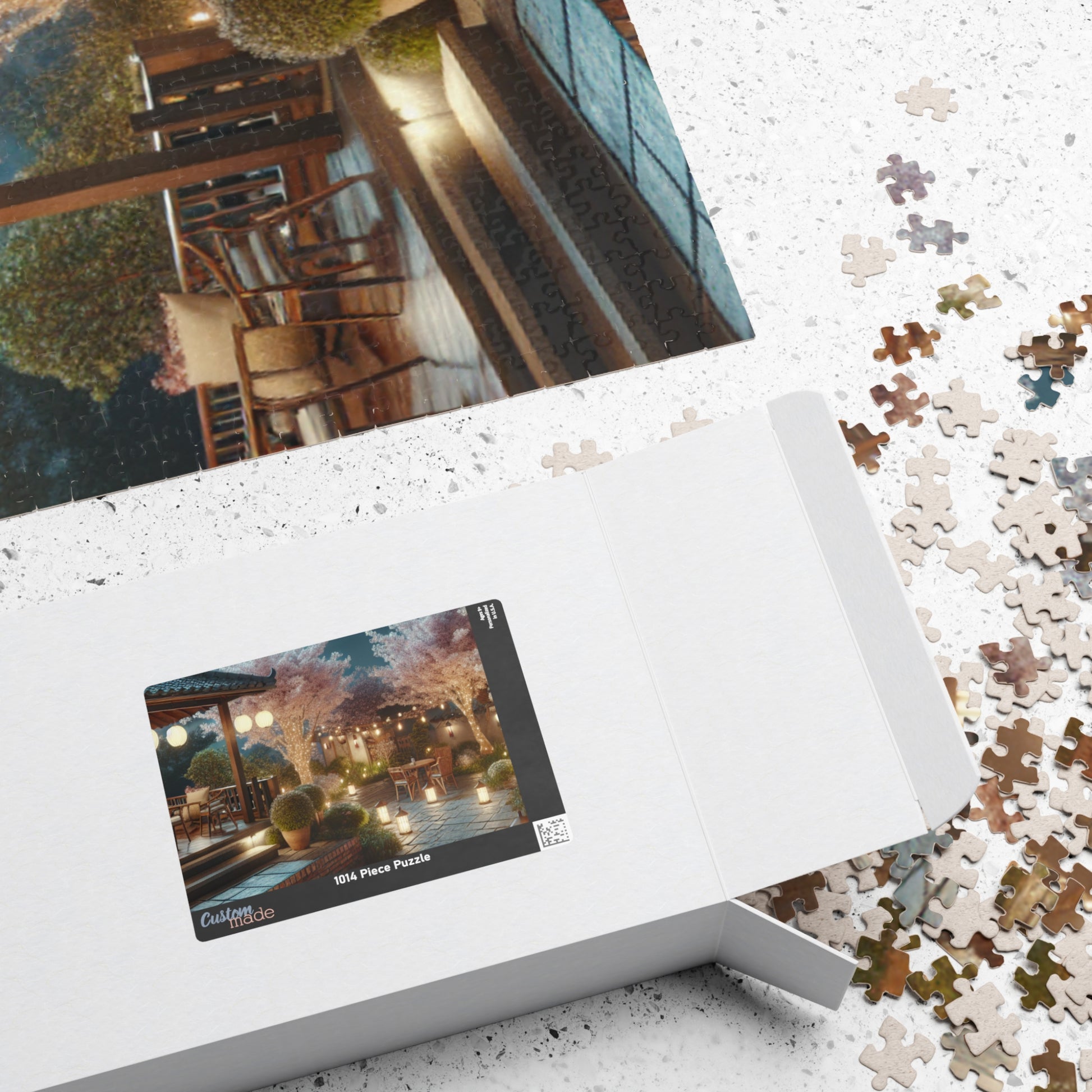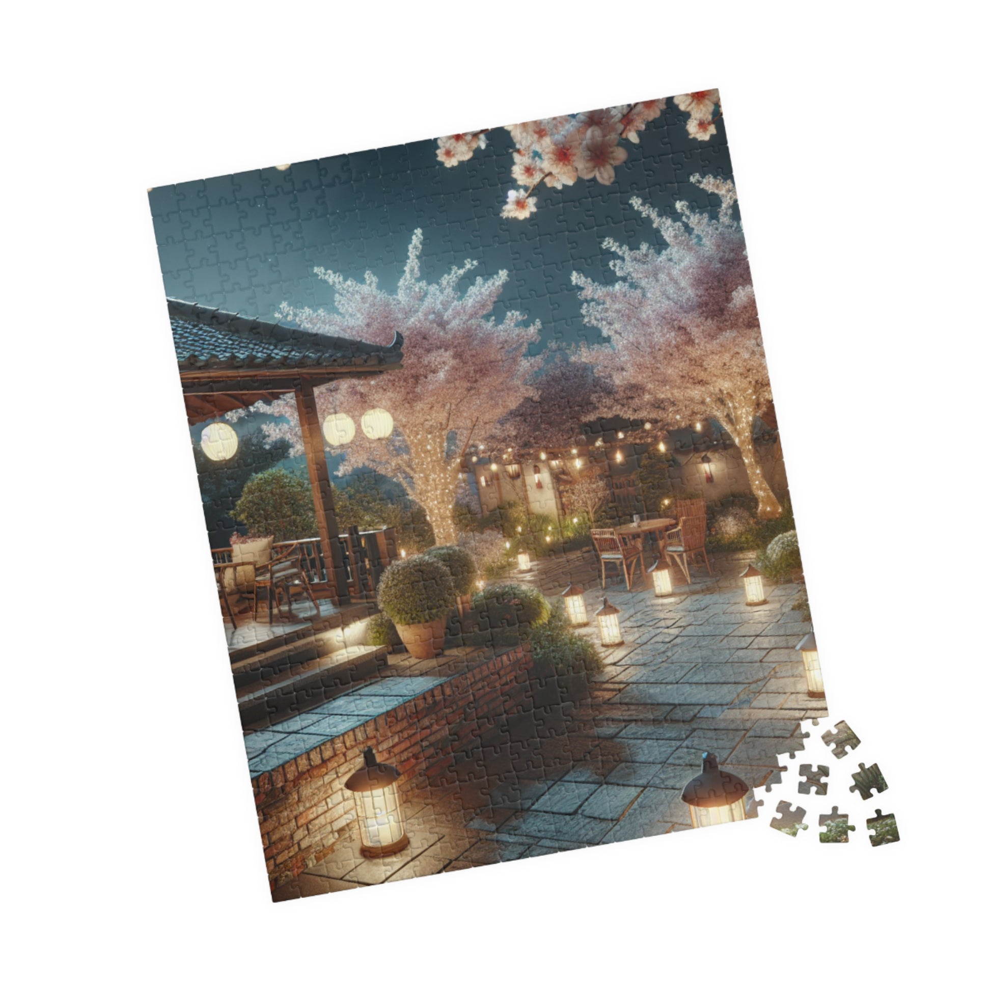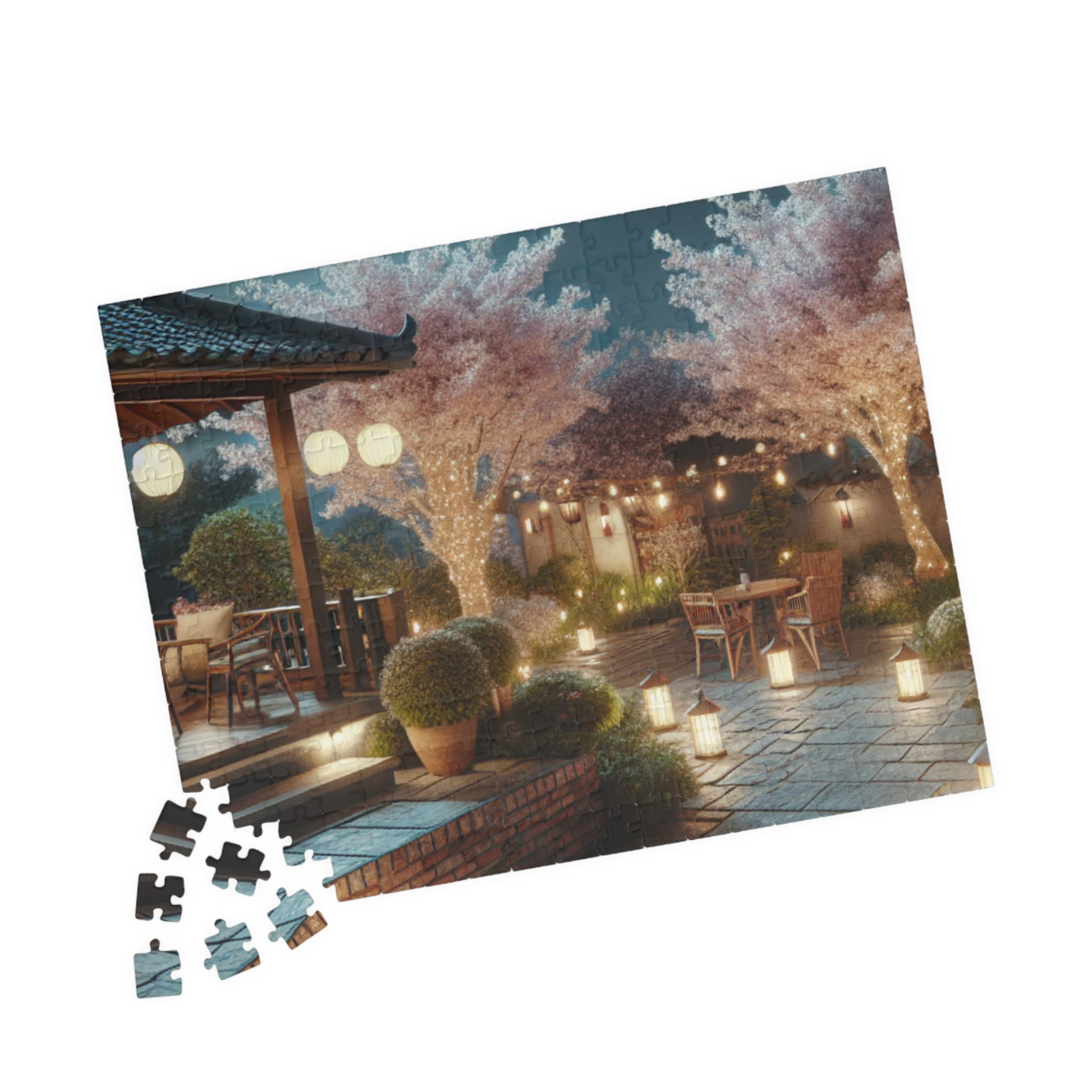Step into a scene of pure tranquility with the Midnight Blossom Porch Puzzle. This puzzle features an elegant, lantern-lit porch gently wrapped in blooming cherry blossoms under a starlit sky. The soft glow of moonlight filters through delicate petals, casting magical shadows on vintage rocking chairs, a warm cup of tea, and a book left open for a quiet return. Perfect for anyone who loves peaceful nightscapes, cozy elegance, and the fleeting beauty of cherry blossoms, this puzzle offers a soothing escape into a world of serenity and nighttime charm.