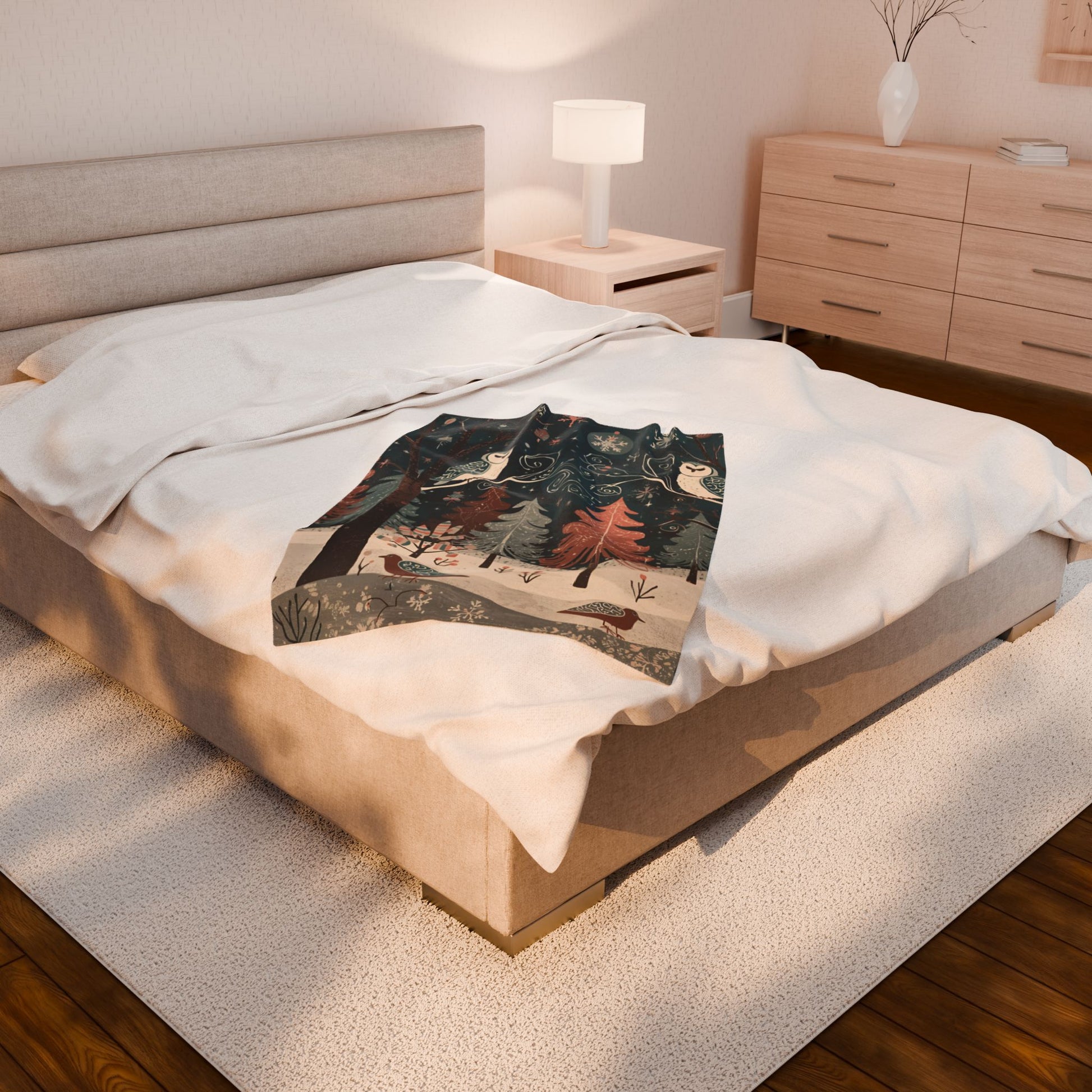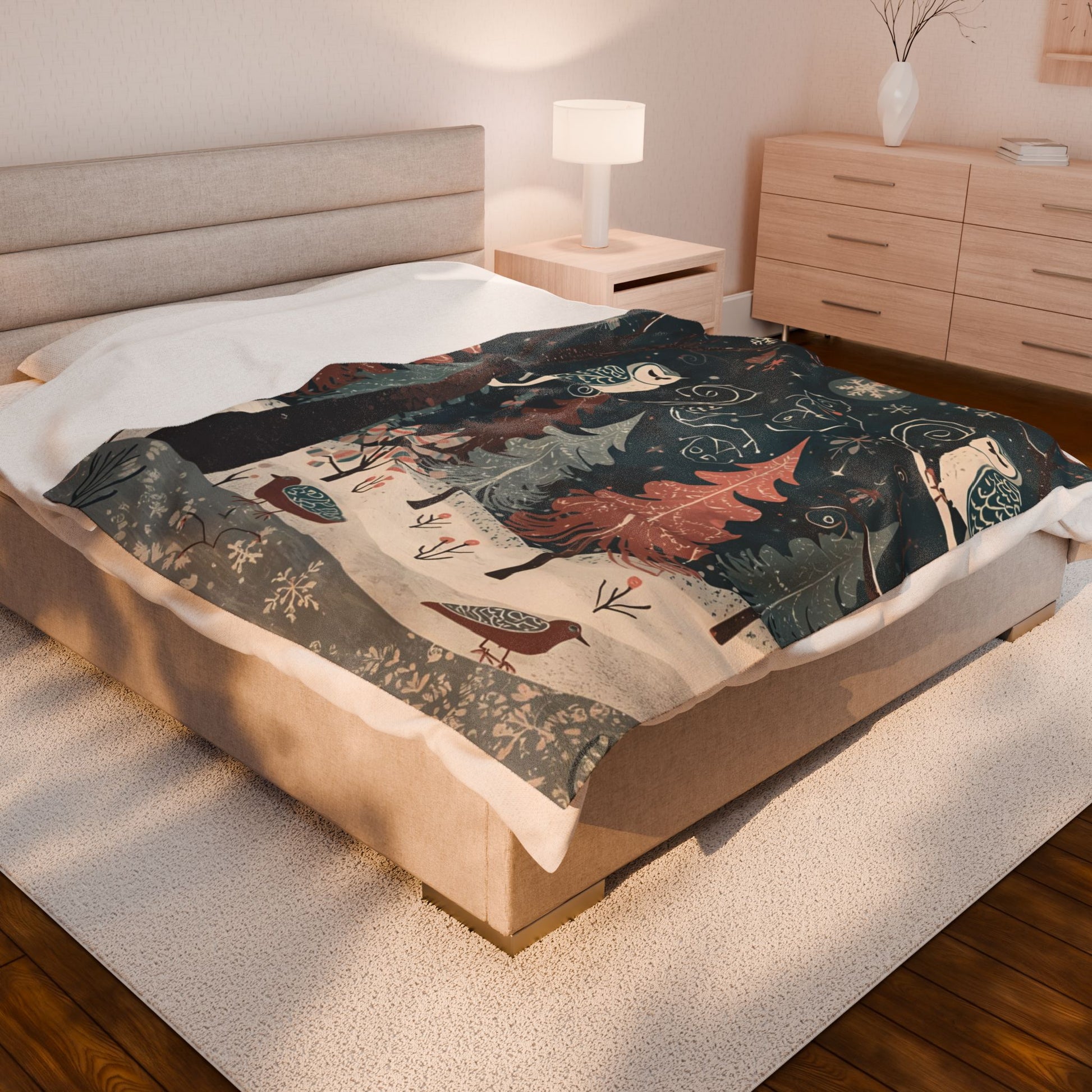 Whimsical Winter Owl Forest Velveteen Plush Blanket | Cozy Woodland Throw | Soft Plush Blanket Gift | Snowy Owl and Pine Tree Decor